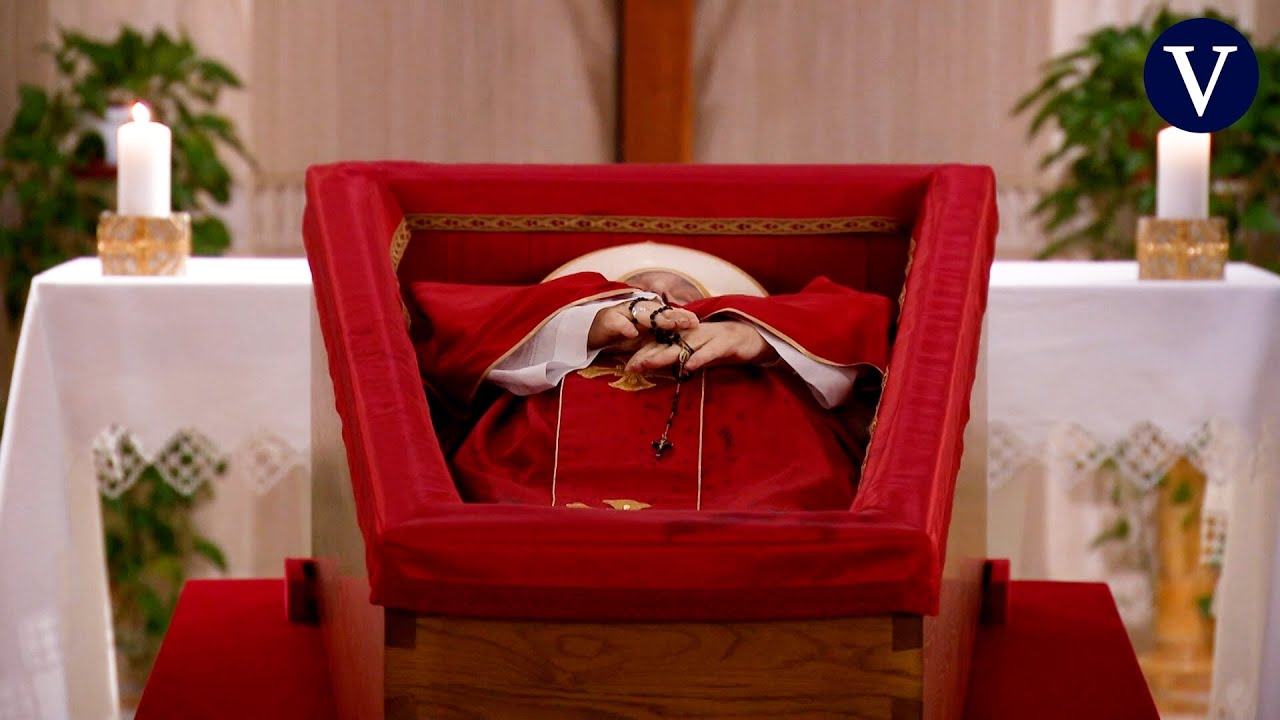 Francisco yace dentro de un féretro de madera forrado en terciopelo rojo, dispuesto en la capilla privada de la residencia, donde permaneció rodeado de sus colaboradores más cercanos y numerosos cardenales presentes en Roma.