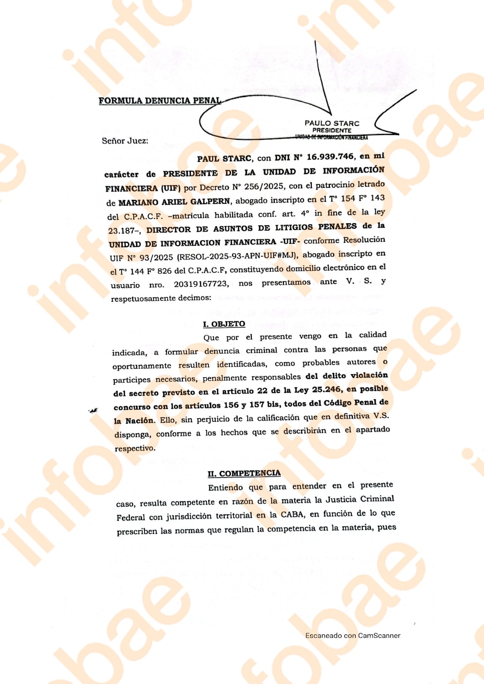 Starc, que firma la denuncia, detalló: “El martes 12 del corriente recibí una comunicación en la cual se me informó que podría existir una filtración de información que contendría ‘informes de inteligencia financiera’ e integraría un Reporte de Operación Sospechosa (ROS) de carácter secreto en virtud de la Ley 25246. La mencionada comunicación identificaba a una persona jurídica probablemente reportada por una entidad bancaria. En virtud de ello, instruí que se realicen las verificaciones conducentes a los efectos de determinar si los datos informados estaban vinculados a un ROS, lo que efectivamente pudimos constatar”.